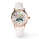Een persoonlijke horloge. Pas het jouw naam aan in gekromde tekst in een blauw-groen lint gelaagd over een charmerend hart gevuld met bloemen en bladeren in roze, groene en gele kleuren. De achtergrond is een gevlekt patroon met cirkels in lichtroze en wit. Summery en grillig ontwerp met een flair.