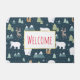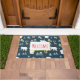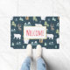 Een welkome deurmat met een festief patroon. Polaire beren, herbouten, bomen, vossen en sneeuwvlokken. Op een donkergroene achtergrond.