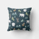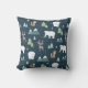 Een kussen met een grillig feestelijk patroon. Polaire beren, rendieren, bomen, vossen en sneeuwvlokken. Op een donkergroene achtergrond.