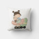 Een schattig kussen voor de kamer van je meisje, met een cartoon meisje dat haar dolly vasthoudt en dat ze op het punt staat in haar pop's buggy of pram te plaatsen. De kleuren zijn roze, blauw en pastelgroen.. het afbeelding is slechts aan één kant van het kussen, de achtergrondkleur is wit. Een andere versie beschikbaar met het ontwerp aan beide kanten.