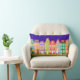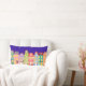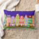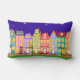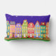 Cute Night Town Walking Cat Pillow. Ideaal voor kinderdagverblijven of kinderen. Stomme cartoons huizen, straatverlichting, nachtelijke hemel met sterren, en zwarte kat die door de straat loopt. Kleurrijk en leuk: blauw, groen, lichtblauw, oranje, roze, geel.