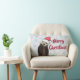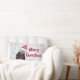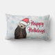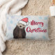 Een lumbaal kussen met een natuur foto van een schattige otter die in het water staat met zijn poten onder zijn gezicht. Het dragen van een rood, handgetekend kerst pet. Een sneeuwvlok achtergrond patroon. De voorkant zegt Vrolijk Kerstfeest. Prettige feestdagen De achterkant zegt