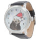 Een horloge met een natuur foto van een schattige otter die zijn gezicht in zijn poten houdt. Het dragen van een rood, handgetekend kerstpet. Een sneeuwvlokpatroon.