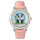 Kut zwart-wit panda beer met een groene bamboevloeg. Hij zit op een groen gras met een blauwe achtergrond. Onder de panda is een sjabloon in grijze letters om jouw naam toe te voegen om deze illustratie te personaliseren.