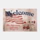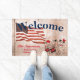 Voeg jouw naam, familie in een manuscriptdoopvont en eerst in blokdoopvont toe, in rood op een weersgekende beige achtergrond die door een vliegende Amerikaanse Vlag wordt gedomineerd en een schattige hand-getrokken zwart-rode fife en trommelband. "Welkom" staat in een vet, diep blauw lettertype boven aan het ontwerp.