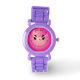 Super cute decora kei style purple watch featuring a bright pink smiling emoji face. There's customisable text circling the watch face, where you can add a name or message
