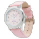 Een horloge op maat met een naam met een illustratie van een schattige slapende poes. De ogen gingen dicht en zagen er gelukkig en vredig uit. Zet op een bleke roze achtergrond.