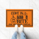Add a playful spooky touch to your doorstep with this Halloween doormat featuring two adorable pumpkins and the cheeky phrase "COME IN FOR A BITE." Perfect for welcoming trick-or-treaters, guests, and goblins alike! Personalize it with your family name to make your Halloween décor truly one-of-a-kind. A fun and festive addition to any porch or entryway!