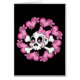 Cute skull en crossbones met polka gestippelde boog omgeven door roze harten en bloemen.