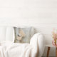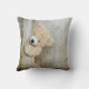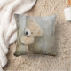 Een kussen met een donkere foto van een schattig gevulde beer, die staat op een stevige wand/achtergrond.
