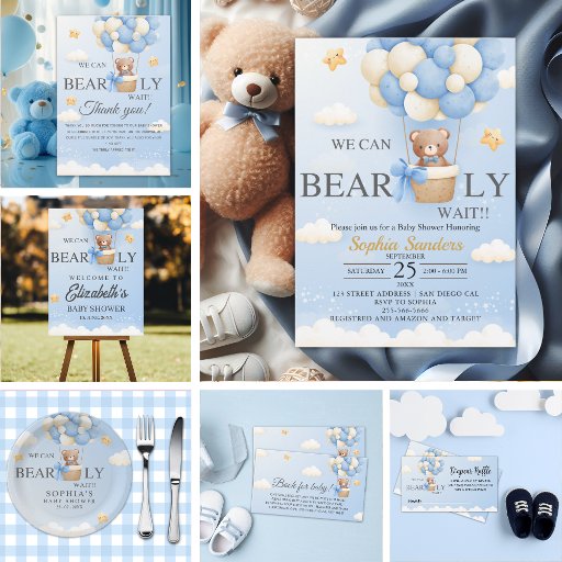 Baby Shower Napkin Design with a Cute Design for your Baby Boy Shower with a Beautiful Watercolor Bear Theme Flying in a Basket with Blue and White Balloons and the phrase "WE CAN BEARLY WAIT" with cute black typography and a blue background with white clouds around it!