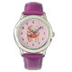 Een horloge met een leuke illustratie van de waterverf. Een bruine teddybeer draagt een groot rood hart. Kleine polka stippen op een roze achtergrond.