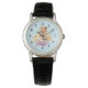 Een horloge met een schattig waterverf schilderij van een moederleeuw die haar baby blokje vasthoudt. Een paarse bloemendoos onder hen voegt een zachte aanraking toe aan dit zoete en schattige afbeelding. Lichtblauwe achtergrond.