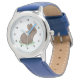 Wat een schattig, realistisch geschilderd konijn met een roze neus in een klaver. Breng de dag van je kind in het kort en help hen om tijd te leren houden met deze schattige pols! U kunt de horlogestijl, de bandkleuren en de witte achtergrondkleur van het ontwerp in de favorieten van uw kind veranderen!