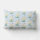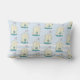 Een gepatenteerde lumbale kussen met een schattige glimlachende dinosaurus, roze roze wangen en RAWR geschreven op zijn buik. 3 kleurrijke gelukkige sterren boven zijn hoofd. Plaats op een lichtblauw en wit patroon van poka punten en strepen.