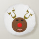 Deze geweldige ronde kussen hebben een grappige cartoon van een rendiertje. Hij heeft donkere ogen en een enorme heldere rode gloeiende neus. De geweien wijzen naar boven en zien er futuristisch uit, waardoor deze rendiersoort een cyber rendier wordt. Hij is nog steeds schattig en vriendelijk.