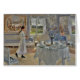 Een schilderij in zachte blues van twee kleine meisjes die een tafel zetten voor een feestje.