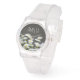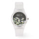 Modern, stijlvol gepersonaliseerd horloge met zonnige madeliefjes op donkergrijze achtergrond.