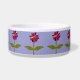 Deze geweldige dierenkom heeft een digitaal afbeelding van een madeliefje met een groene stengel met twee groene bladeren erop en paarse, rood en zwart gekleurde bloemblaadjes met een paarse kern. De bloemblaadjes zien eruit alsof ze zijn gemaakt van glanzend plastic dat het licht heeft opgevangen en een iriserend effect heeft veroorzaakt. De achtergrond is een kalmerende blauwe kleur.