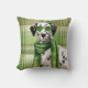 A Dalmatian makes a cute dog lover pillow with the black and white pup wearing green sunglasses and a cool matching scarf while standing against a great sage green plaid. A great gift for anyone and perfect for dorms, office, living room and bedrooms.