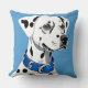 Illustratief portret van een Dalmatische hond die een blauwe halsband draagt, met zijn kenmerkende zwarte vlekken tegen een schone blauwe achtergrond, die hondenelegantie, dierenverzorging en dierengezelschap vertegenwoordigt.