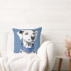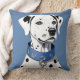 Een digitaal geïllustreerde Dalmatische hond met zwarte vlekken, met een stijlvolle blauwe kraag, weergegeven tegen een bijpassende blauwe achtergrond. Elegante en artistieke weergave van een populair hondenras.