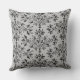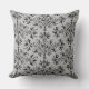 Een vierkant gooiend kussen met een elegant damppatroon van mazen en bladeren met zwarte rollen op lichtgrijs.