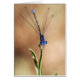 Mannelijke blauwe dancer damselfly (31-36 mm) landt, vliegt er af en landt opnieuw op een stuk gras. Als hij landt zijn vleugels nog steeds enigszins verspreid van zijn vorige gevecht. Blauwe dansers zijn in het zuidwesten van de zomer een gemeenschappelijk gezicht. Deze man werd gevonden in Gilbert, Arizona. Foto van Ruth Jolly.