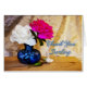 Rozen in een vaas zeggen dankjewel aan een schat. Oorspronkelijk kunstwerk dat twee rozen in een blauwe vaas toont met rosebuds die op de lijst liggen.