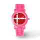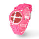 De rood-witte vlag van Denemarken, of Dannebrog, heeft een Noordse of Scandinavische kruis. Het rood is de achtergrond, het kruis is wit. De Deense vlag is hier te zien op een horloge met gele cijfers. Het horloge dat wordt getoond is een kindhorloge, maar u kunt het ontwerp overbrengen naar een herenhorloge en/of een kinderhorloge.