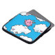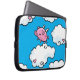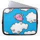 Een laptophoes met een digitaal roze cartoon varken met kleine witte vleugels, danst op wolken die met harten in de heldere blauwe hemel zijn gekletst.