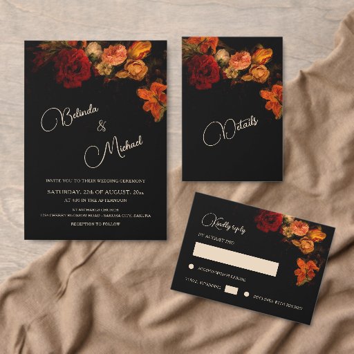 Colorful painted flowers and bride and groom names in an elegant classic calligraphic script on a black background wedding invitation.