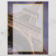 Letterhead met een foto van het beroemde Europese landmerk: de Eiffeltoren, die in een opwaartse hoek wordt genomen en een interessant perspectief biedt. De foto biedt een mooie afsluiting van het interessante werk van de toren in de metalen roosters. Een semi-transparante bekleding met een gouden grens wordt boven geplaatst om op te schrijven.