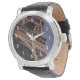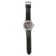 Een horloge met een foto van de beroemde Europese bezienswaardigheid - de Eiffeltoren genomen in een opwaartse hoek waardoor het een interessant perspectief geeft. De foto geeft een mooie close-up van het interessante metalen roosterwerk van de toren.