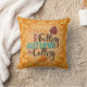 Oranje herfstkussen met kleurrijke bladeren en tekst die zegt: "Bladeren vallen. De herfst roept."