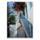 Een typische trap van straatniveau naar een van de grote huizen op Mykonos. De blauwe trap viel op tegen de witte wasdruppels van het eiland.