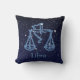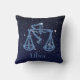 Werp hoofdkussen die het dierenriemsymbool voor Weegschaal in zacht zilveren die blauw kenmerken, met de sterren van de constellatie, tegen een sterrige die hemelachtergrond wordt bedekt van diep middernachtblauw aan zwarte wordt gesorteerd.