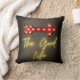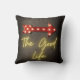 Fun gooi kussens met een gevoel - met "The Good Life" neon yellow text en een rode pijl van de markttentbol op een onderdrukkende achtergrond.