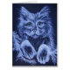 dit is een acrylschilderij van een kleine witte kat op een zwarte achtergrond met groene ogen .