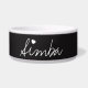 Gepersonaliseerd naambowlen voor huisdieren wordt gecreeerd in een "witte krijt op zwarte plank"stijl. Er is een wit hart boven de 'i'. Als de naam van uw huisdier geen 'i' in de spelling heeft, kan dit hart afbeelding worden verwijderd of gewoon worden vergroot en op een andere plaats op de mok worden geplaatst.