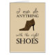 Dit schattige ontwerp is voorzien van een hielkop en de tekst "Ik kan alles doen met de juiste schoenen". Het perfecte geschenk voor elke schoenenminnaar!