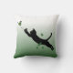 Een zwarte kat met groene ogen die in de lucht springen om een mooie groene vlinder te vangen.