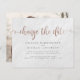 Yikes! Onvoorziene omstandigheden zijn moeilijk te plannen, maar met deze huwelijksuitstel kaarten kun je je geliefden gemakkelijk laten weten! Met een witte marmerachtergrond. De woorden "verander de datum"verschijnen bij de bovenkant in een faux manuscript van de gouden folie van het roos met zoete cirkels. Als onderdeel van de begrotingsselectie hier op Zazzle, komen deze uitnodigingen in beperkte omvang en in papiervoorraden. Als u een andere grootte of papiervoorraad nodig hebt, kan dit ontwerp worden overgebracht naar een standaard 5x7 formaat met het gereedschap voor de overdracht van het ontwerp voor meer opties.