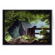 Een schilderachtig uitzicht langs een houtstrook, met de ochtendmist nog in de weide rechts. Een oude dame die een onbevreesde loop voor de hectische dag. Reproductie van een origineel schilderij van de waterverf.
