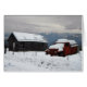Een wijnstok op het platteland met een sneeuwdeksel, een vervallen, oude, rode vrachtwagen die in de buurt van een ramshackle hut nabij Sandpoint zit, ID.