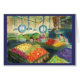 Twee producenten stapelen zorgvuldig de kleurrijke groenten en fruit in hun kraal op en schikken deze. Twee schalen hangen in harmonie met de cijfers. Gesmolten in acryl en pastel op papier.
