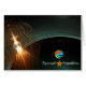 A shiny, golden fractal image, sort of a cross between a Fresnel lens and a bird cage, represent a Soviet-era lunar landing module. Het beeld is superimposed on an a background resembling the dark side of the moon and stars. Russian text "Л у н ы к н й о kubieke kubieke schokken" — moship, or lunar ship also appears, bracketing a red star. De Soviet Union developed a lunar lander intending to land two cosmonauts on the moon before the United States could do so. The vehicle was successfully tested in earth orbit four times. Development problems with the rocket intended to take it to the moon led to the cancellation of the USSR's manned lunar program.