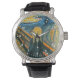 De Scream Wrist Watch - Betoverend meesterwerk schilderij met een schreeuwende schedel op een brug in Noorwegen bij zonsondergang "De Schreeuw" is van de Noorse kunstenaar Edvard Munch. Munch heeft verschillende versies van 'The Scream' gemaakt. Het Munchmuseum bezit een van de twee geschilderde uitvoeringen en een pastel. De Nationale Galerij van Noorwegen bezit de andere geschilderde versie. Een vierde versie, in pastel, is eigendom van een Noorse zakenman. In 1895 maakte Munch een lithografie van het afbeelding. "De Schreeuw" heeft de dubbele eer om een van de beroemdste schilderijen in de geschiedenis te zijn, evenals een van de meest crimineel gerichte schilderijen aller tijden. In 1994 werd de versie in de National Gallery of Norway gestolen. Het werd enkele maanden later teruggevonden. In 2004 werden zowel 'The Scream' als 'Madonna' gestolen uit het Münchsmuseum. Beide schilderijen werden in 2006 gerestaureerd. Ze hadden enige schade opgelopen en gingen in mei 2008 weer tentoongesteld, na een restauratie te hebben ondergaan.