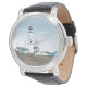 Deze tekening bevat een witte, groene en zwarte vuurtoren die het zee over het hoofd zien. De lucht is blauw met een paar wolken. Witte huizen met groene daken omringen de vuurtoren. Dit ontwerp is beschikbaar op de horloges van vrouwen, mannen en kinderen.
