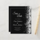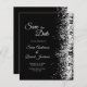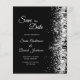 Deze budgetzwart glittering Evening Sparen de datumkaart kenmerkt een zilveren het schitteren druppels op de zwarte achtergrond. Houd er rekening mee dat enveloppen NIET bij dit ontwerp zijn inbegrepen. Als je enveloppen nodig hebt, controleer je collectie of koop je deze los van de markt.